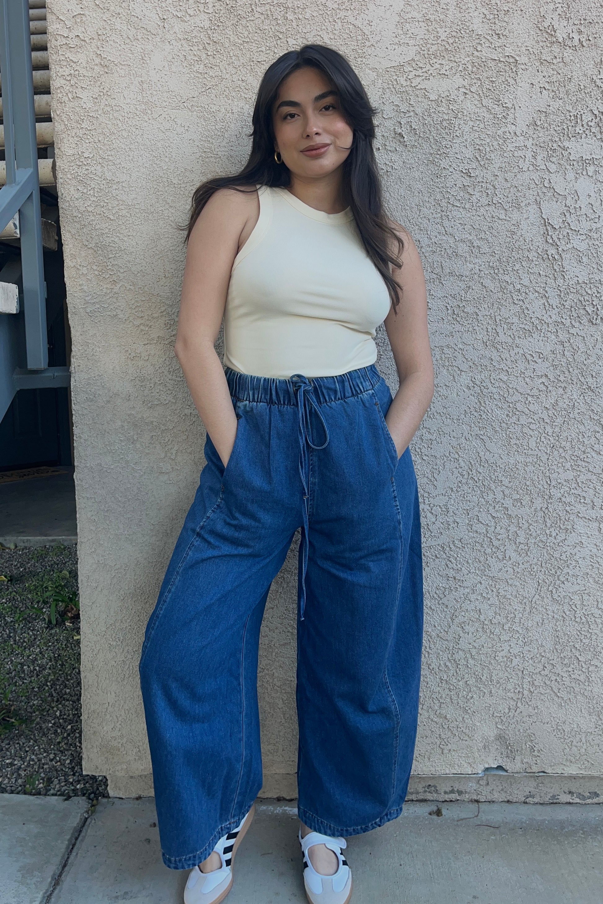 Effortless comfort meets relaxed style with these loose barrel jeans. Featuring a comfortable elastic waistband that moves with you, these jeans offer a modern silhouette that's perfect for casual days. The roomy barrel cut provides freedom of movement while maintaining a contemporary look. Pair them with your favorite tee or sweater for an easy, put-together vibe that works from morning to night.